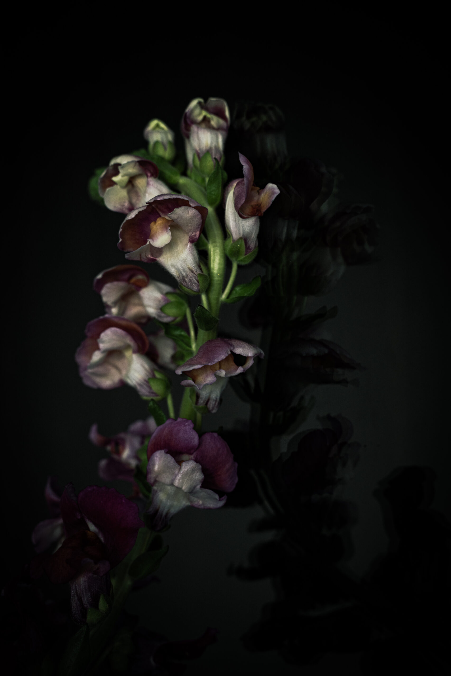 I had been given a bouquet of snapdragons, including a few white ones that I photographed as well. These pink ones, however, I photographed in my bathroom. The bathroom mirror created a reflection that appears only as a shadow. What is only hinted at becomes more compelling.